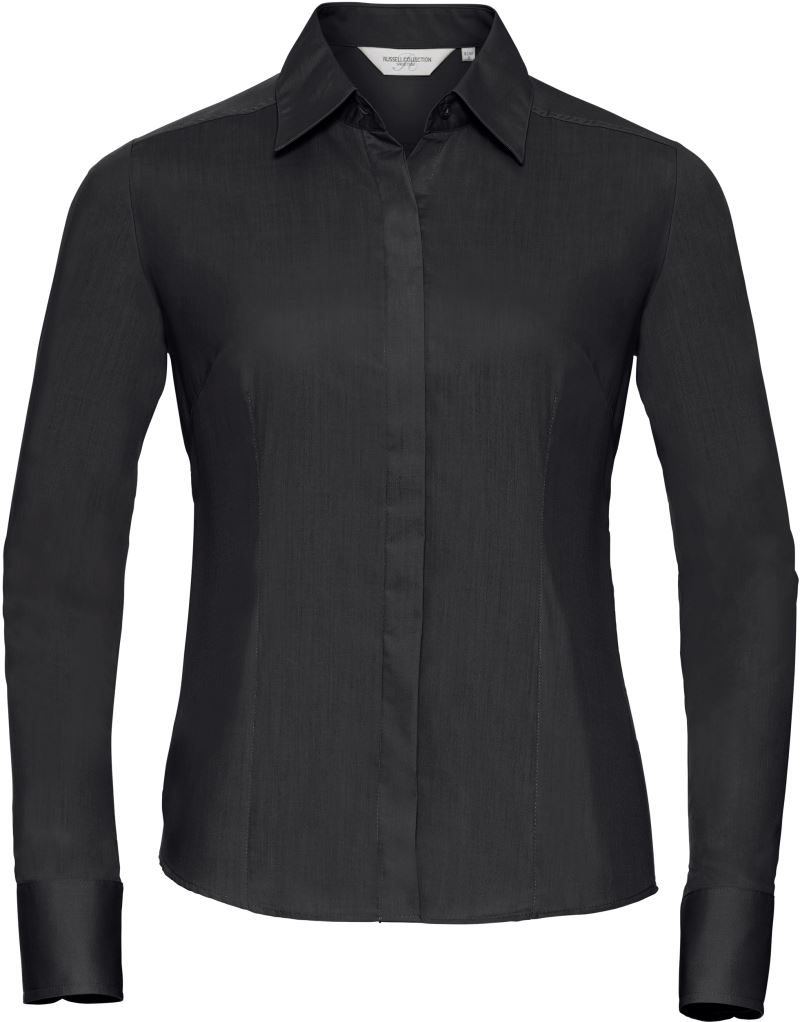 Taillierter Schnitt mit Abnäher an Vorder- und Rückenteil, taillierter Schnitt, verdeckte Knopfleiste, Schulterpasse, abgerundete, mit 2 Knöpfen verstellbare Manschetten, abgerundeter Saum, Ersatzknöpfe, Easy Care, 50° waschbar, trocknergeeignet